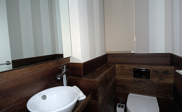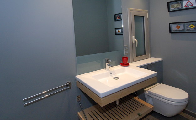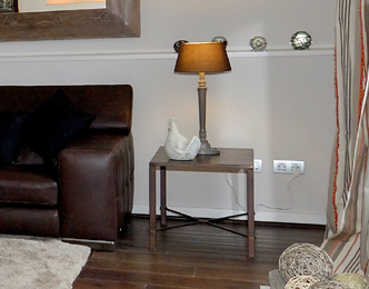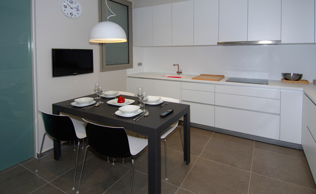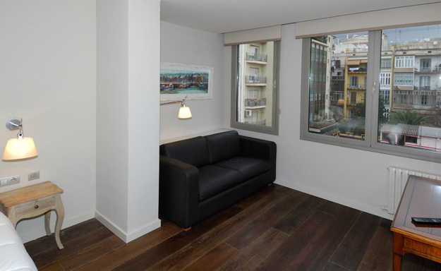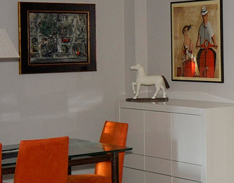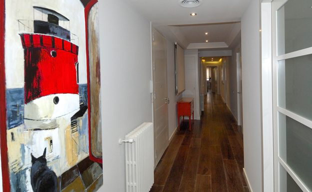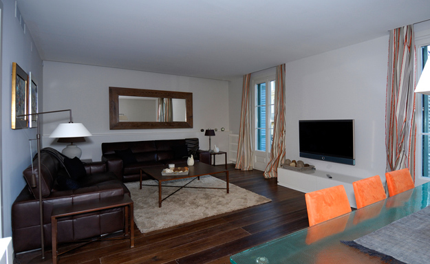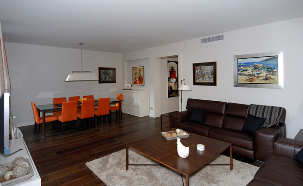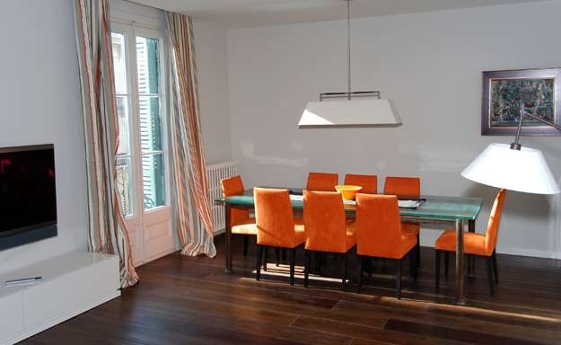 A spectacular hand made wooden floor in the living areas... Large living/dining room with a carefully chosen mix of modern and handmade, furnishings in wood/glass & iron... Two comfortable sofas, 47" Loewe TV flat Screen and two balcony doors opening our south to C/ Mallorca.